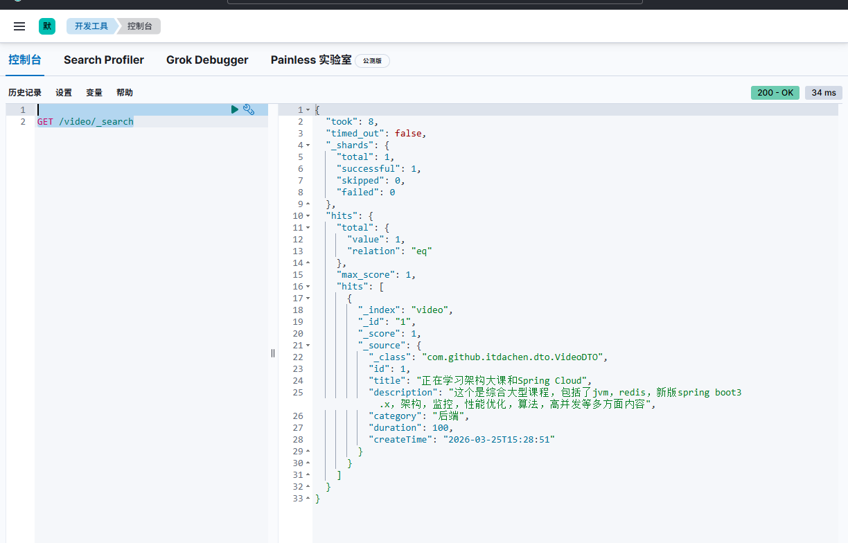 }在 Kibana 中执行 GET /video/_search 查看信息
