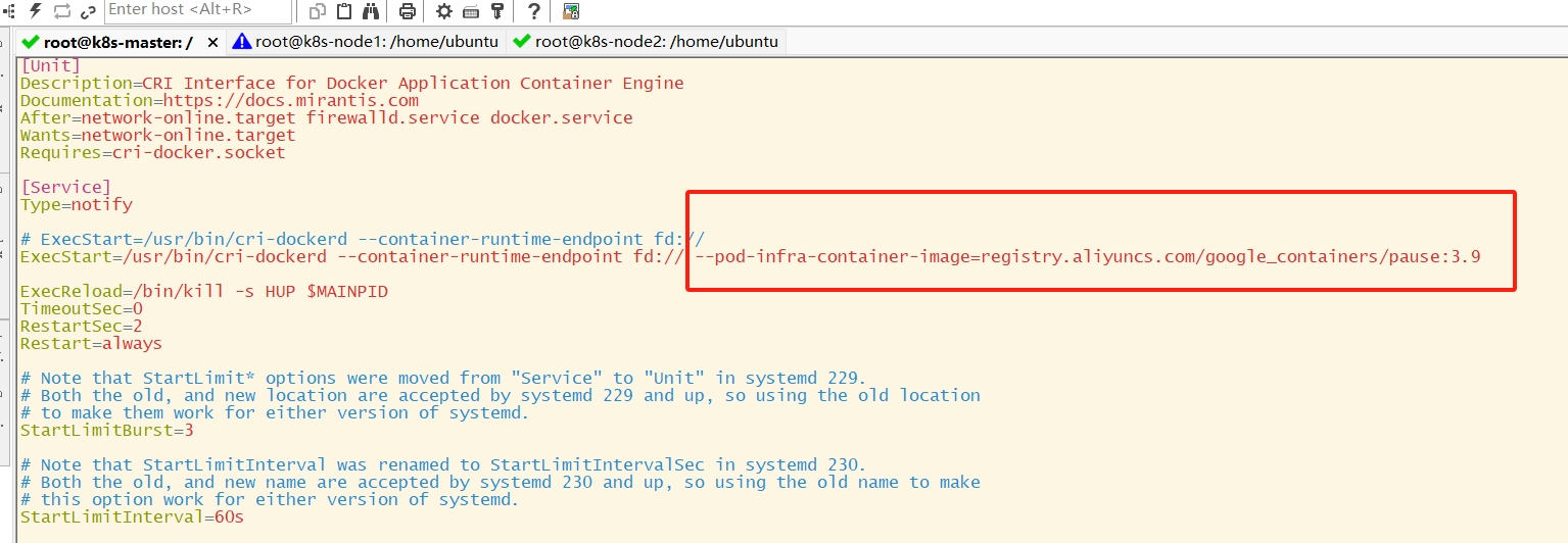 vi /usr/lib/systemd/system/cri-docker.serviceExecStart=/usr/bin/cri-dockerd --container-runtime-endpoint fd:// --pod-infra-container-image=registry.aliyuncs.com/google_containers/pause:3.9