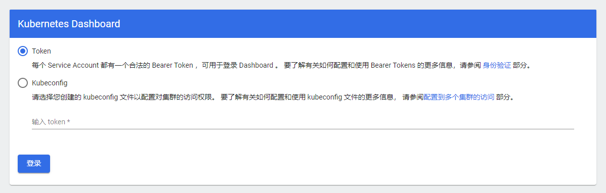 kubectl get pods -n kubernetes-dashboard所有 Pod 的状态都显示为 “Running”,说明 Dasboard 安装成功。浏览器访问 “https://<节点IP地址>:30001 ”, 将看到登录界面,如图所示