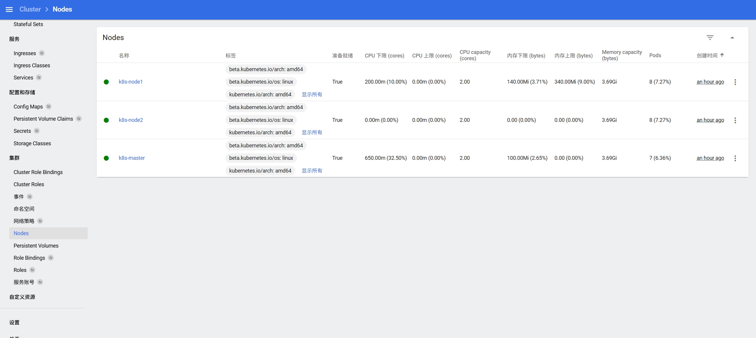可以在 Master 节点执行 kubectl get nodes 命令查看节点,结果如下: