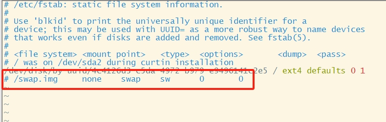 - 设置开机启动生效 为了确保重启系统后继续有效,将系统表文件 “/etc/fstab” 中文件系统类型为 “swap” 的行注释。