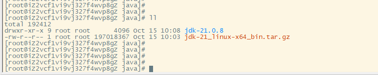 tar -zvxf jdk-21_linux-x64_bin.tar.gz # 解压(zvxf 后面接实际安装包名称)解压之后, 可以通过 ll 命令查询是否解压, 如下图