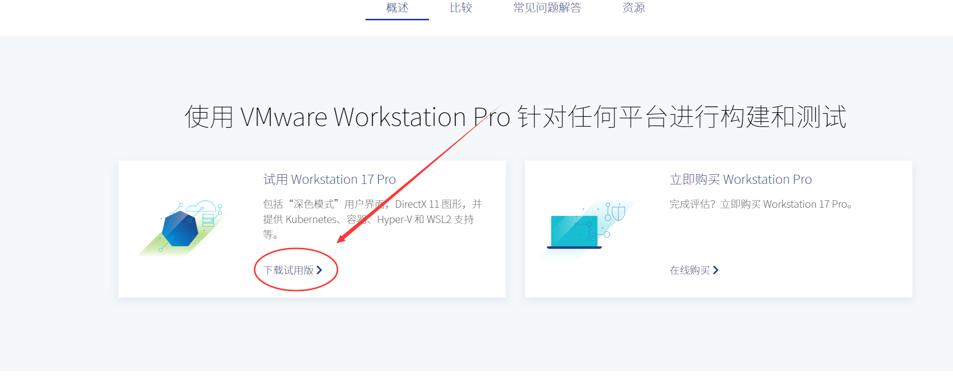 进入下载页面, 下载试用版即可。下载地址:https://www.vmware.com/cn/products/workstation-pro.html