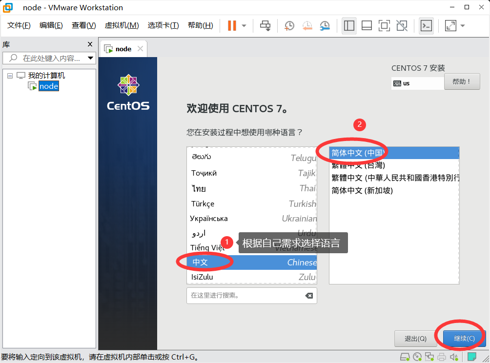鼠标移动到虚拟机内部单击或者按下Ctrl + G,鼠标即可移入到虚拟机中。按下Ctrl + Alt,鼠标即可移出虚拟机。选择系统语言
