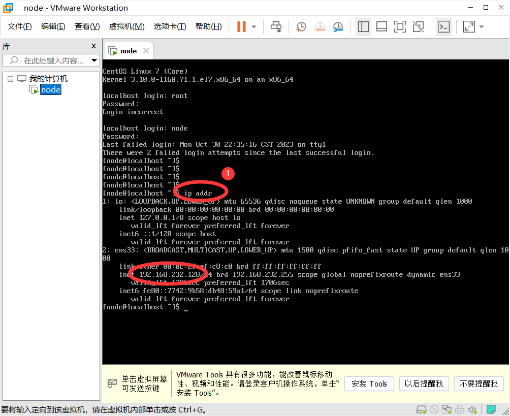su root在这一步的时候, 虚拟机 IP 可能发生改变, 需要通过 ip addr 重新查看虚拟机 IP 地址