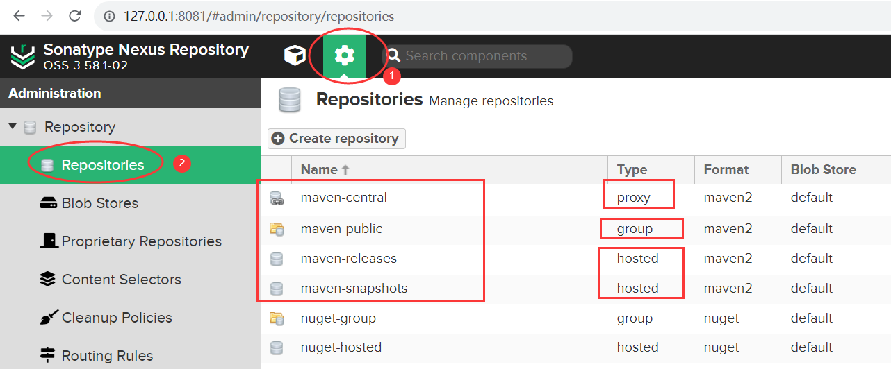 私服 Nexus 的仓库类型有:proxy,hosted,group 三种。