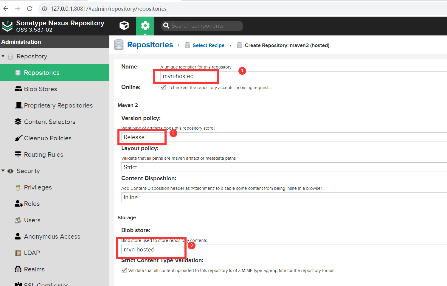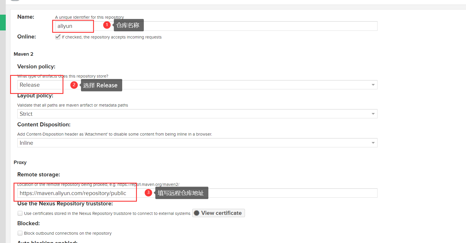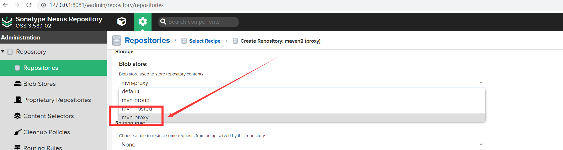 将版本同样选为 Release ,表示该仓库中的是已发布的依赖, Blob Store 同样选中上面创建的 mvn-hosted: