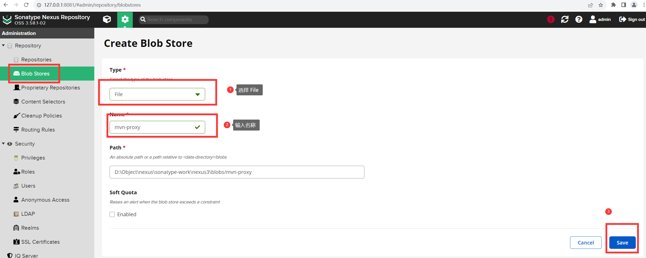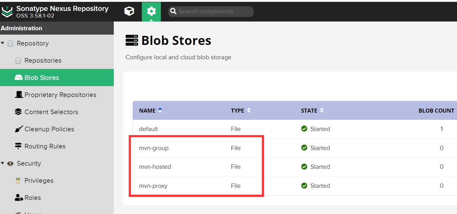 先创建三个 Blob Stores: mvn-proxy、mvn-hosted、mvn-group