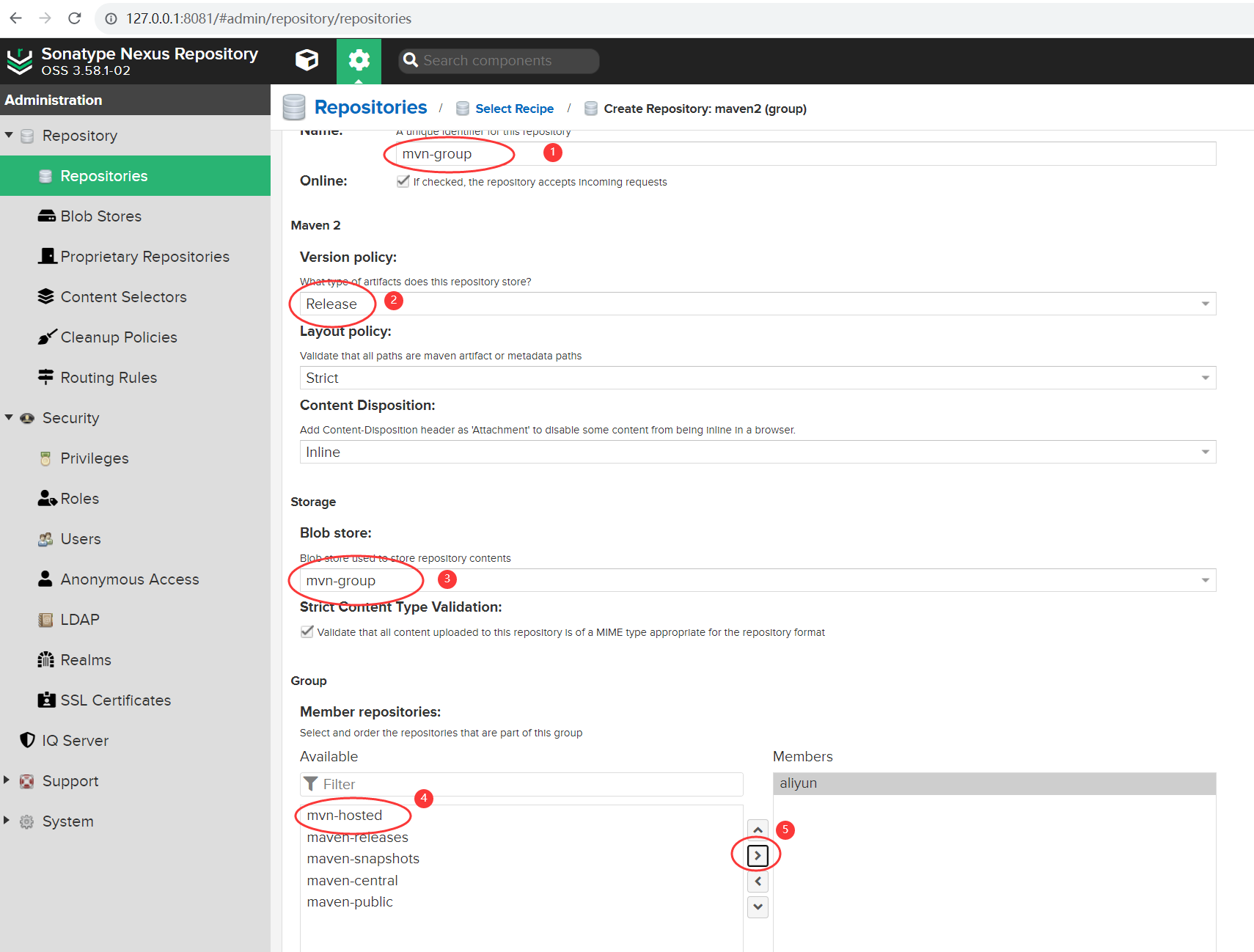 将版本同样选为 Release , Blob Store 同样选中上面创建的 mvn-group, 然后下面的分组需要将上面创建的两个仓库加上,注意顺序,在拉取依赖的时候是根据这个顺序从上往下进行的: