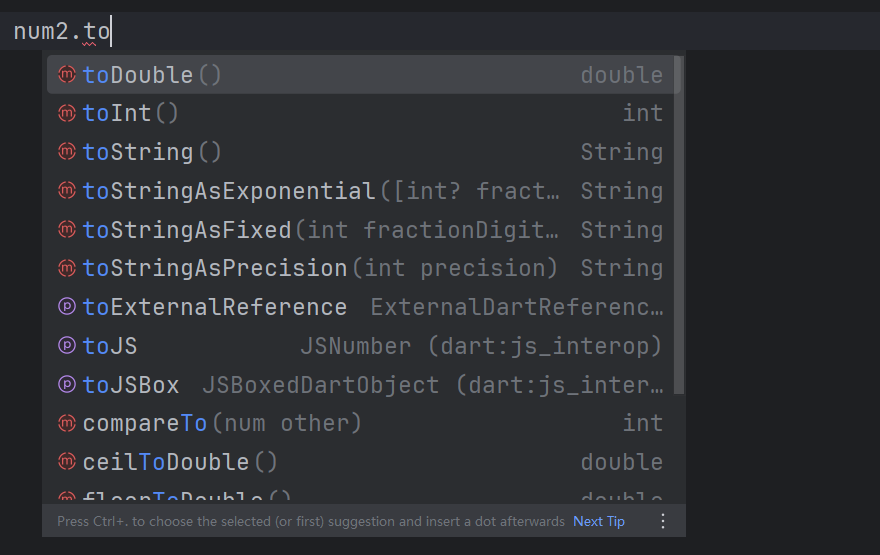 print("num: ${num1},num2: ${num2},int: ${int1},double: ${double1}");