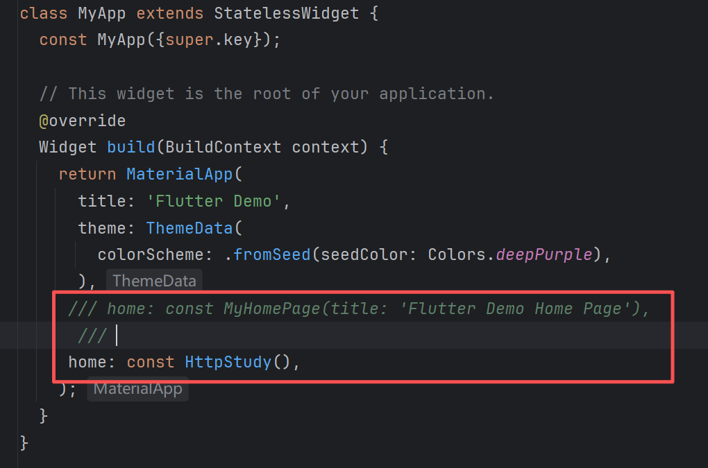 在 main.dart 中注释调原有的 home,添加 HttpStudy