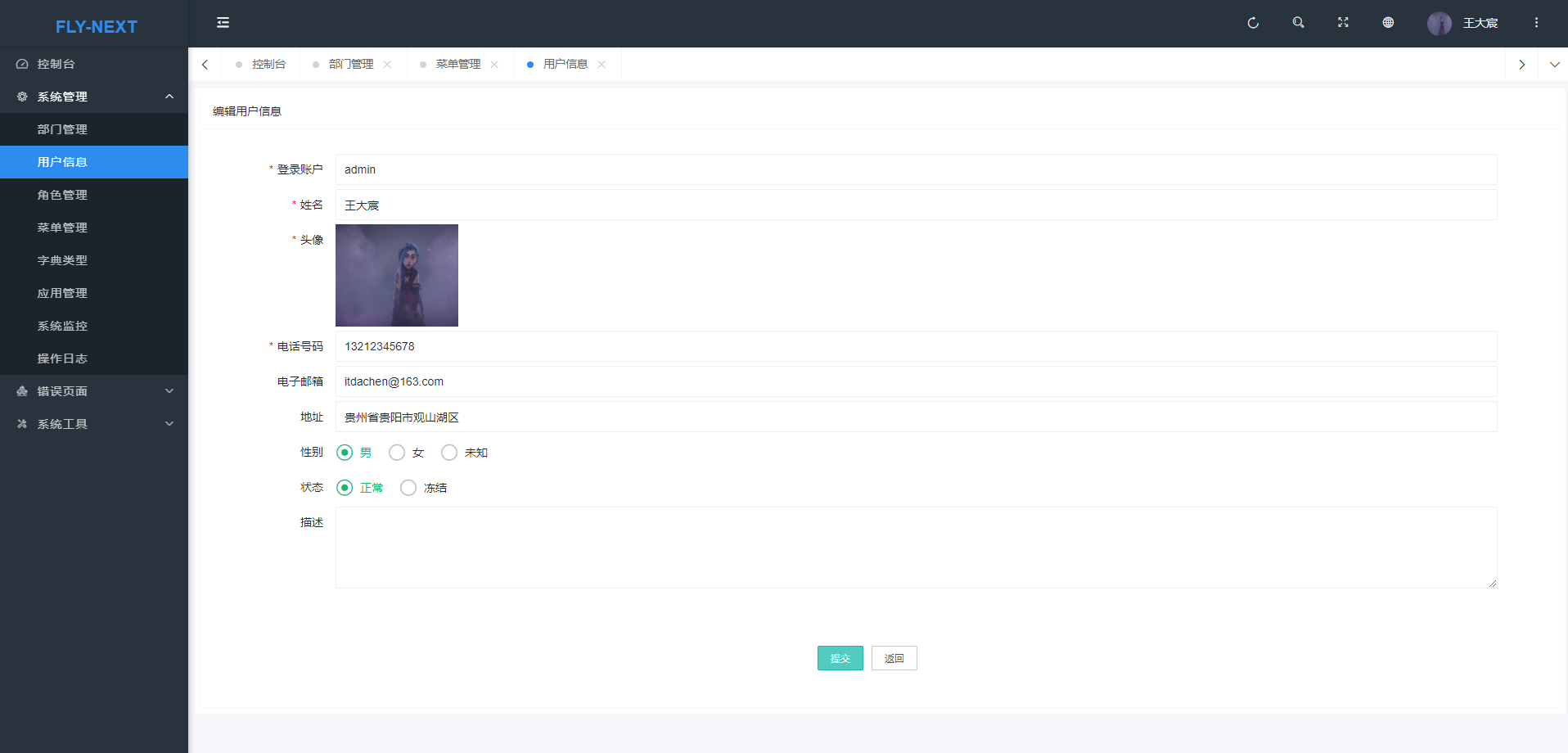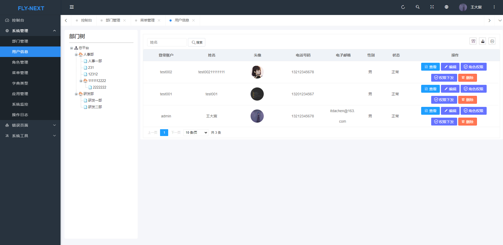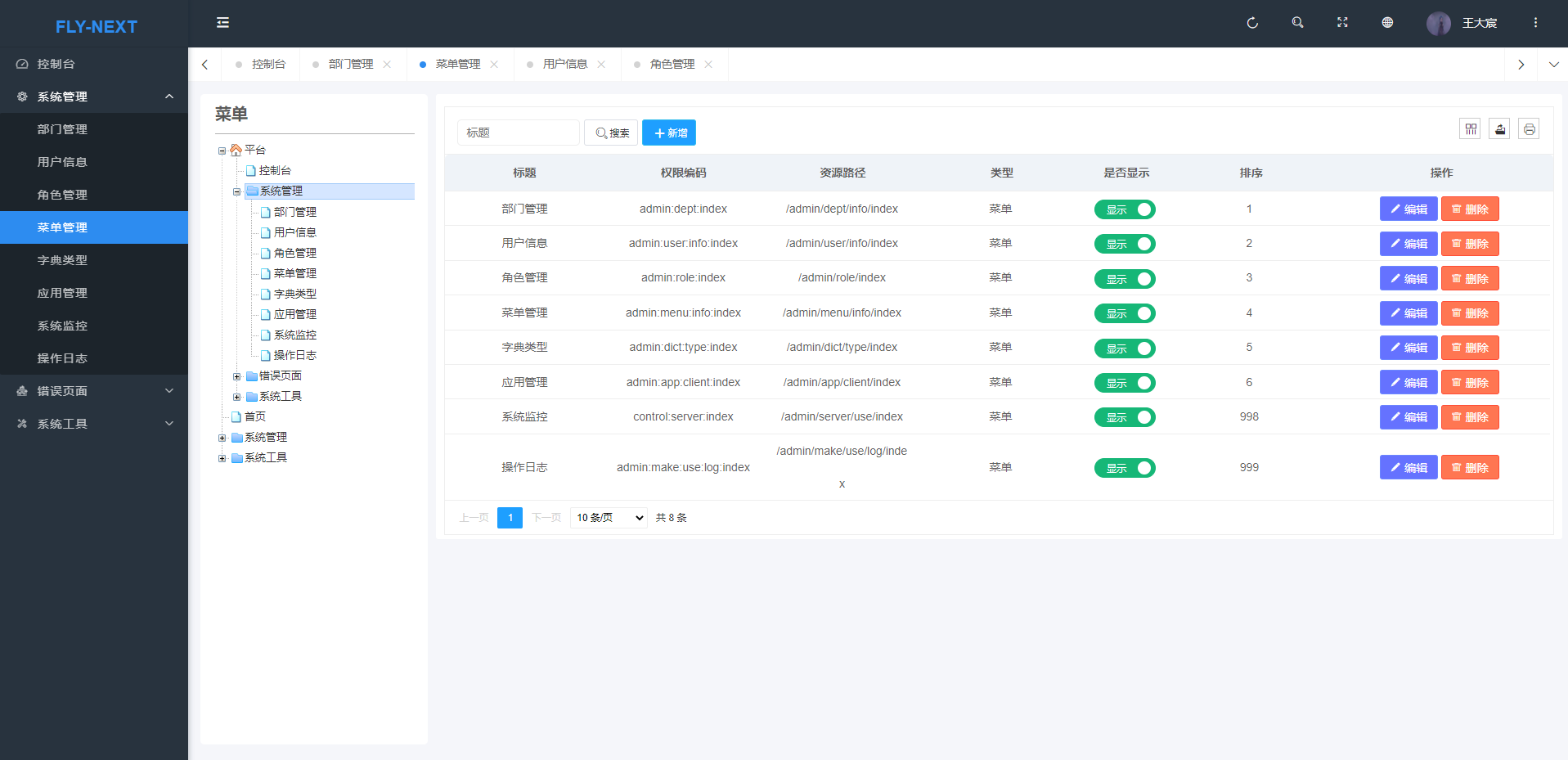 - 菜单管理:配置系统菜单,操作权限,按钮权限标识等。