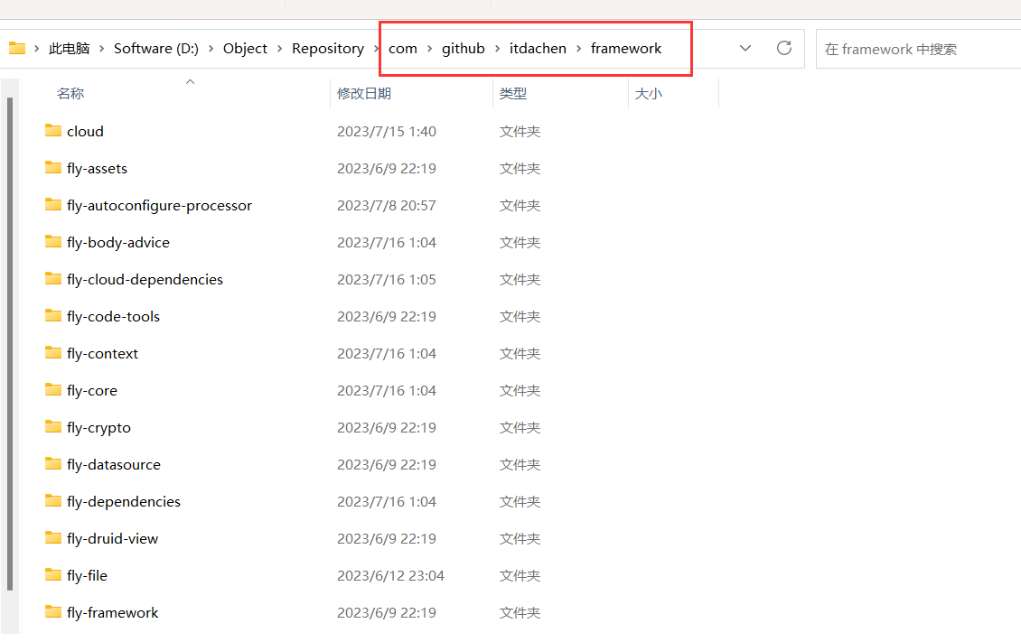 mvn clean install将 Fly-Framework 依赖打入本地 Maven 仓库后,在本地 Maven 仓库中 com/github/itdachen/framework 中找到, 如下图