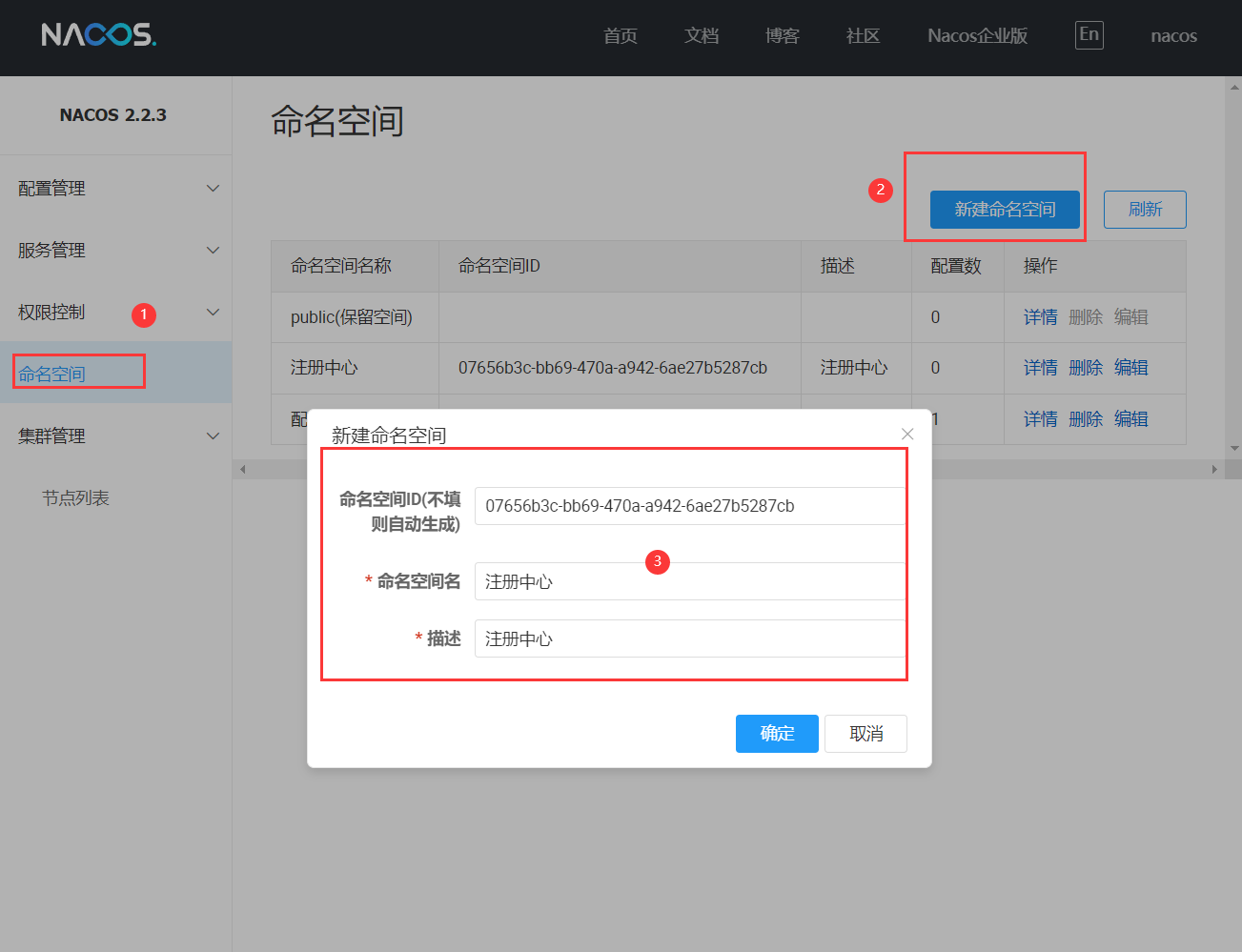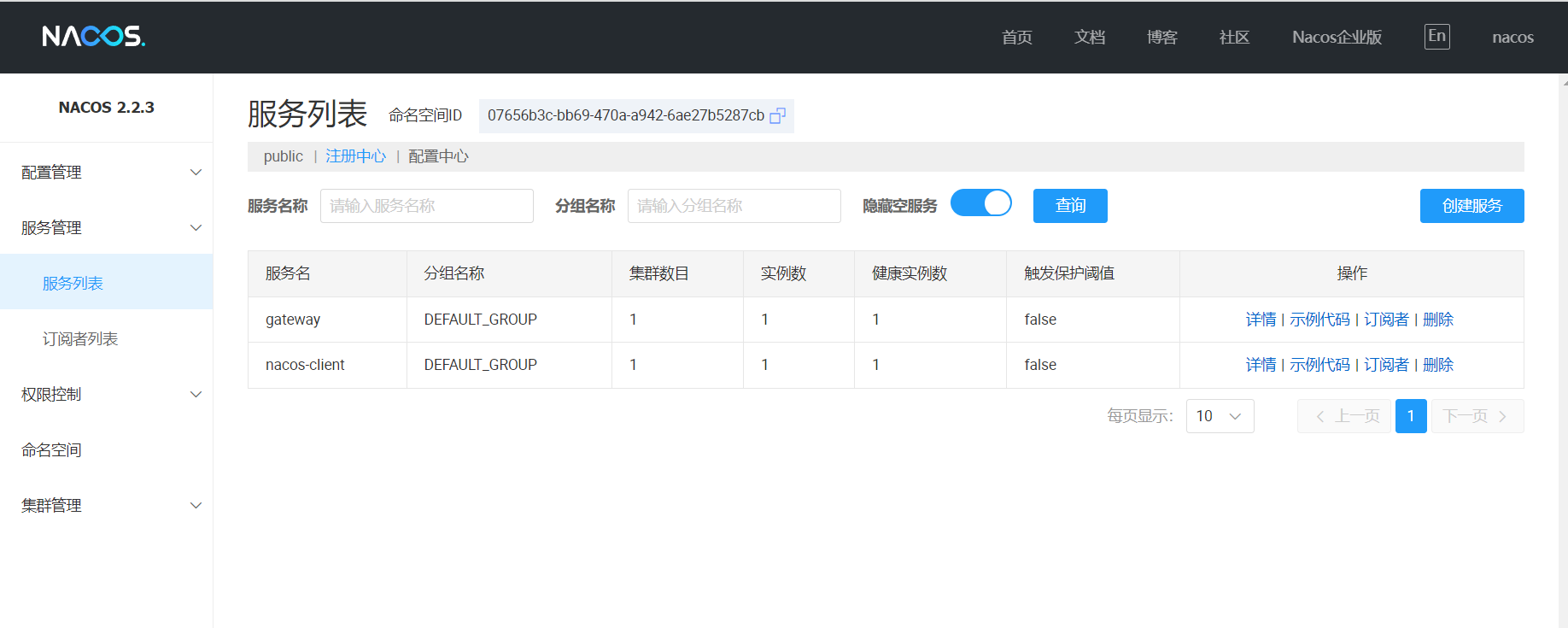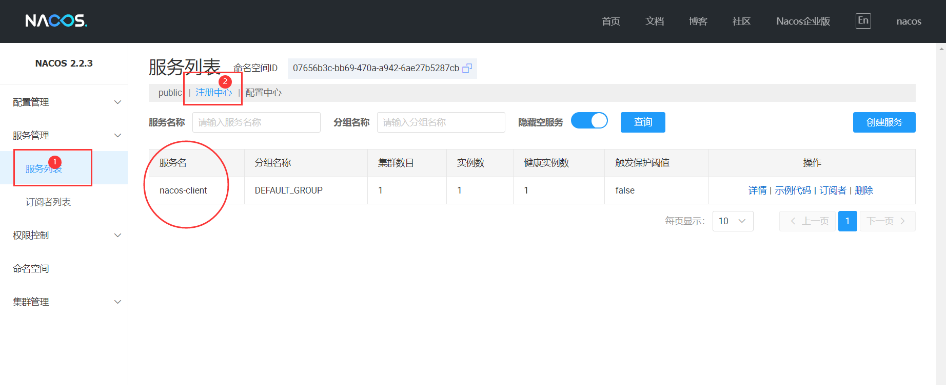 登录 Nacos, 命名空间, 命名空间为: 07656b3c-bb69-470a-a942-6ae27b5287cb(命名空间可以自己自定义, 配置文件中指定到命名空间即可)