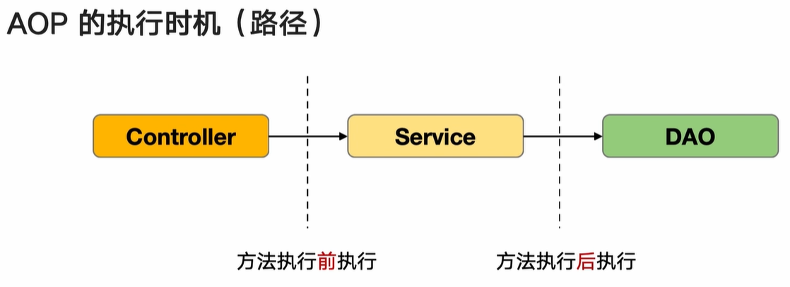 AOP 执行时机,在 Service 前后执行,将分散在各个业务逻辑代码中的相同代码通过横向切割的方式抽取到独立模块中