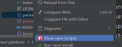 将鼠标放在 package.json 文件上,右键, 选择 show npm Scripts